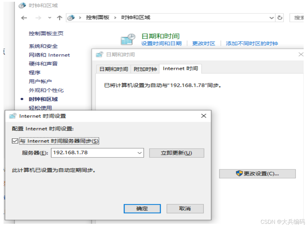 在控制面板->时钟和地区->日期和时间->Internet时间 填写设置的ntp服务器域名大概ip地址,立刻更新验证。