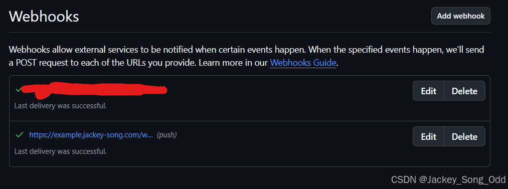 Webhooks是GitHub提供的一种通知方式,当GitHub上发生特定事件时,会向指定的外部Web服务器发送HTTP POST哀求,从而通知这些服务器有关事件的信息。