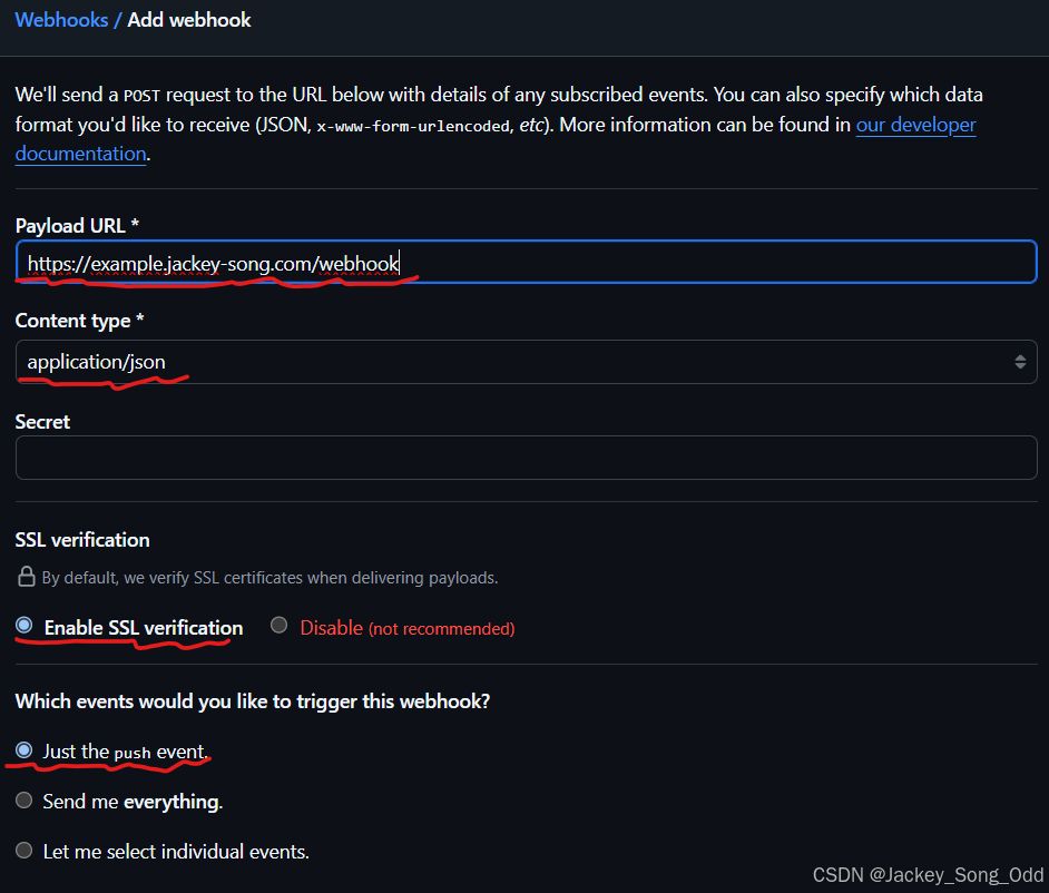 配置 Webhook:在GitHub上,开发者可以为特定的仓库或构造配置Webhook。配置过程中,需要指定Webhook的URL(即外部Web服务器的吸收地址)以及要订阅的事件范例。