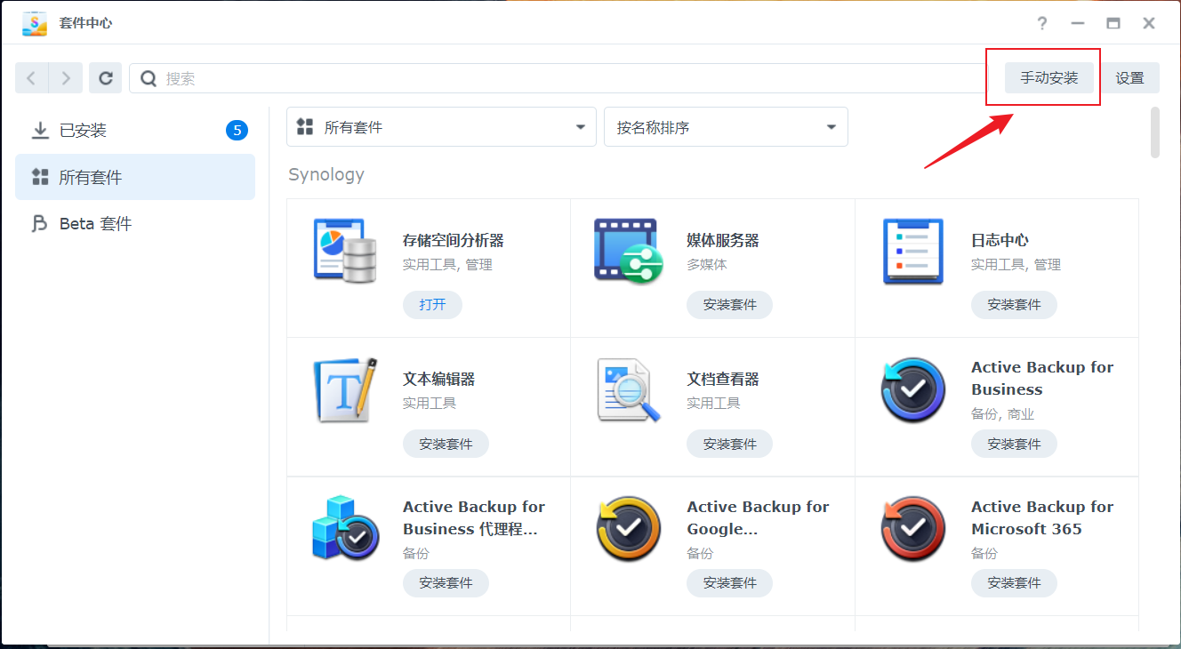 打开群晖套件中央,点击右上角的手动安装按钮。