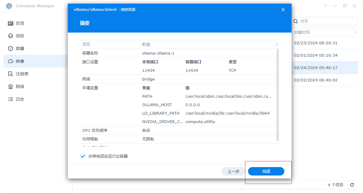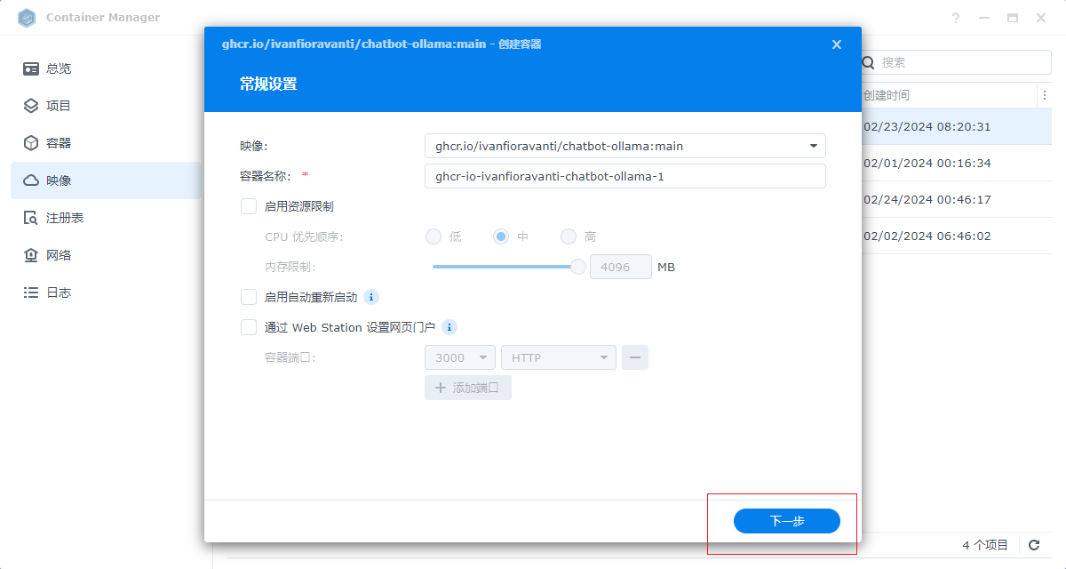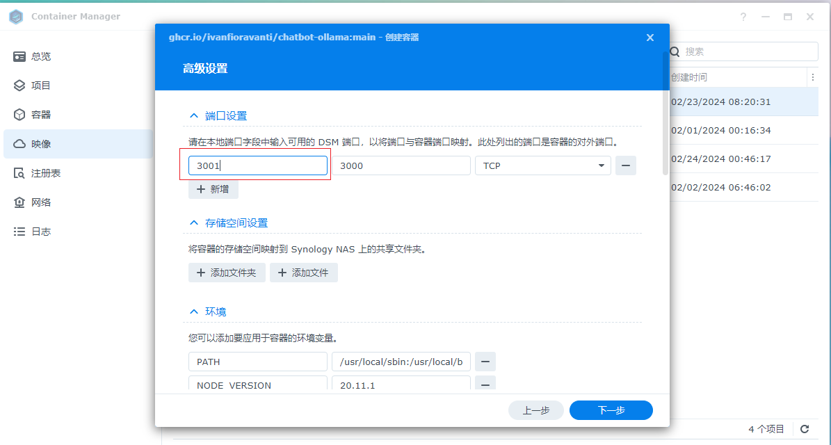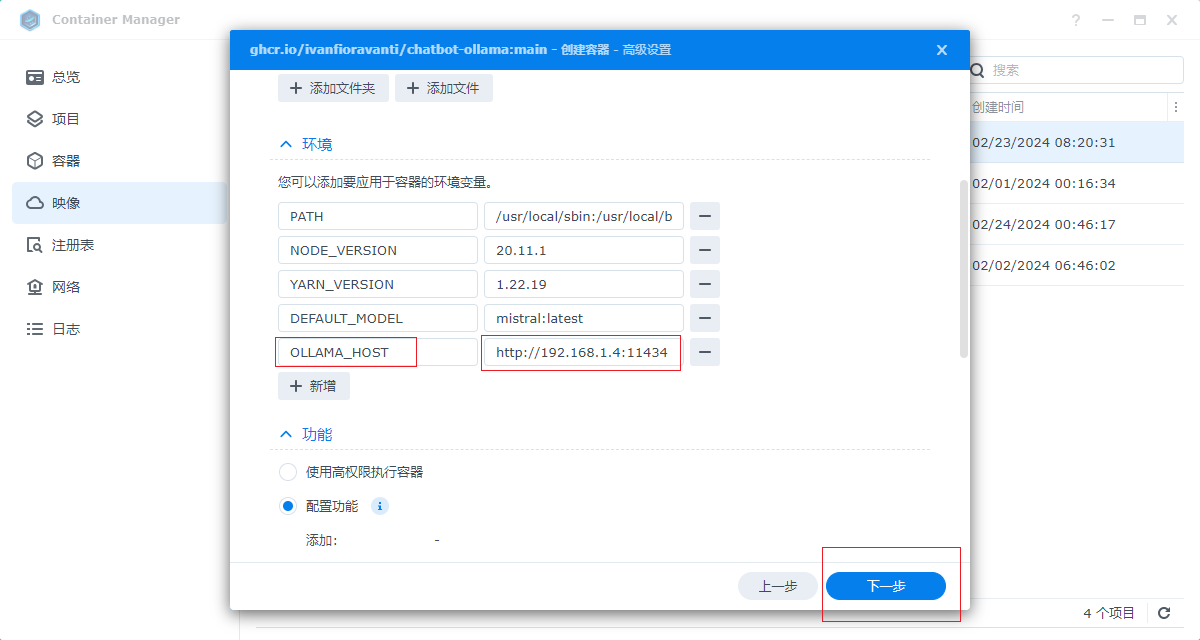 然后设置一个环境变量,该变量就是连接我们上面运行Ollama框架服务的所在,我们设置当地所在:http://群晖局域网IP:11434即可,设置完成点击下一步,然后直接点击完成即可,chatbot Ollama镜像就运行乐成了,接下来我们举行当地访问.