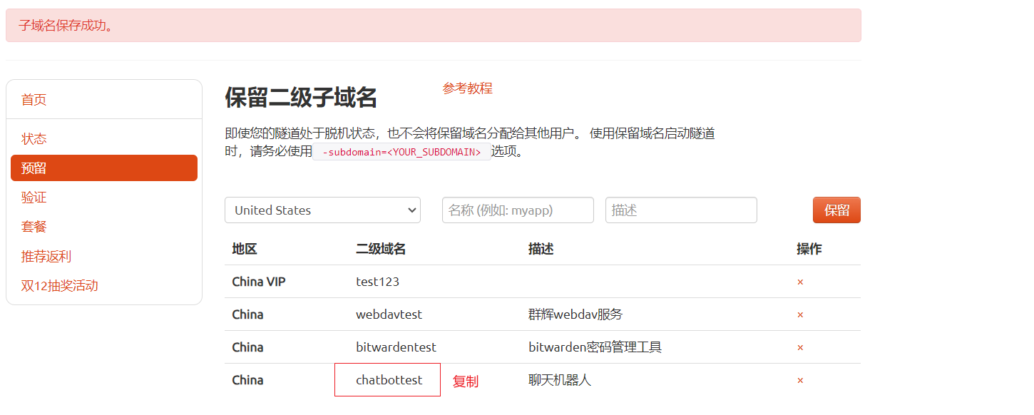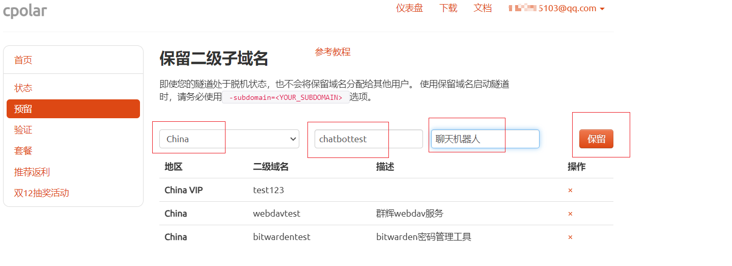 登录cpolar官网,点击左侧的预留,选择保存二级子域名,设置一个二级子域名名称,点击保存,保存乐成后复制保存的二级子域名名称