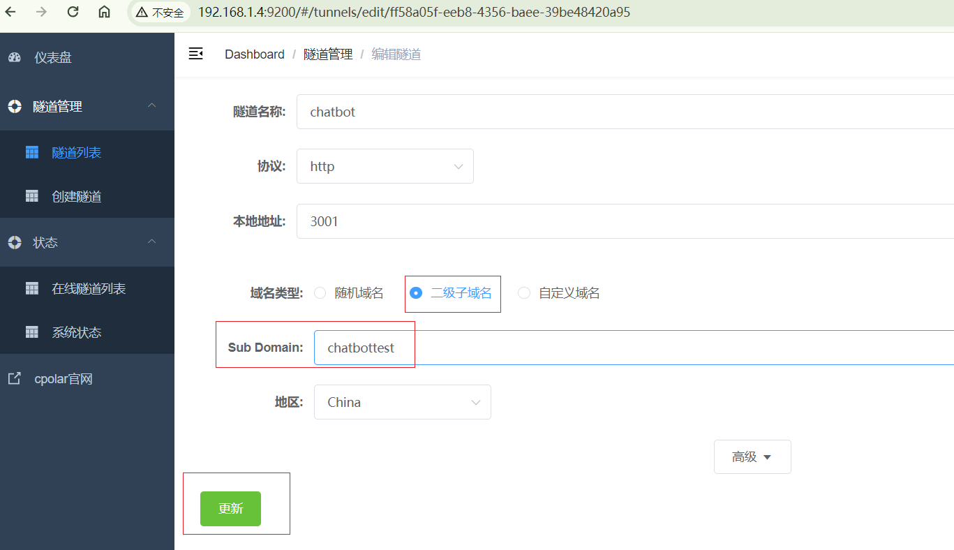 修改隧道信息,将保存乐成的二级子域名配置到隧道中
