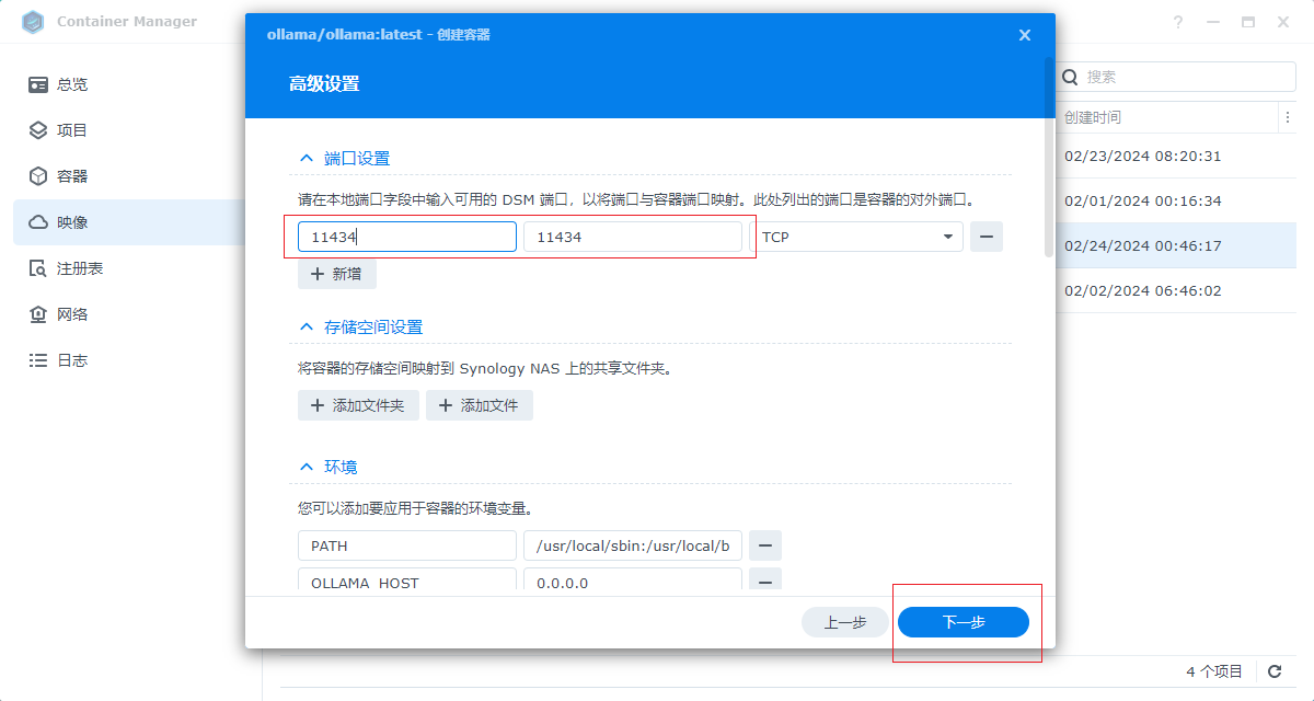 输入外部访问的端口,和容器内部端口一致,填写11434即可,然后点击下一步