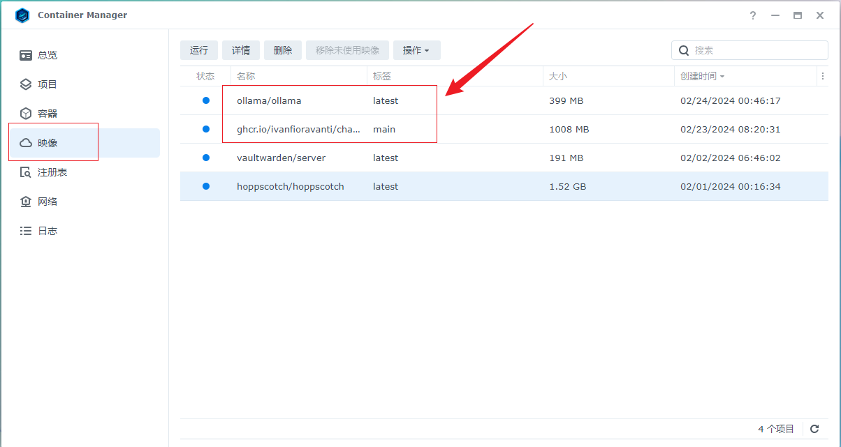 复制代码 拉取乐成后,我们可以在Docker界面看到拉取的两个镜像,下面开始运行两个镜像,首先运行ollama