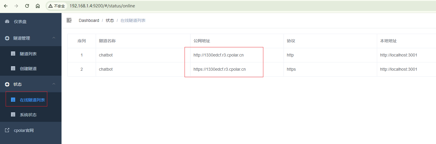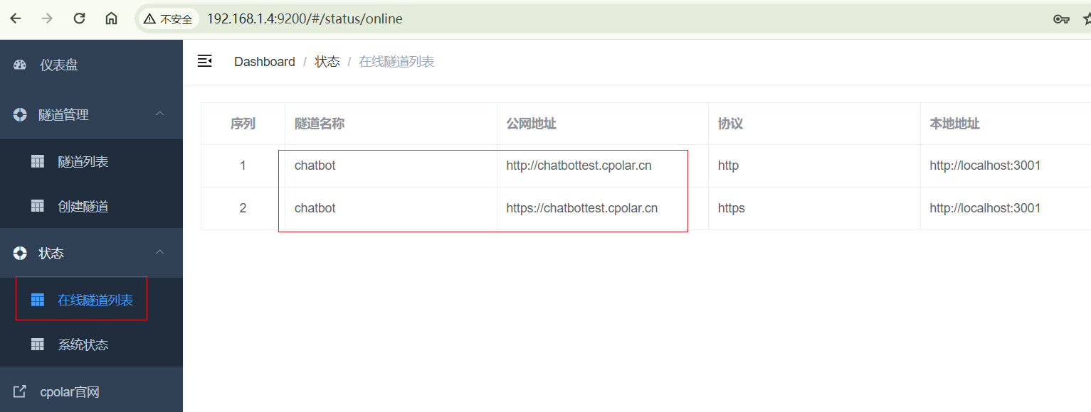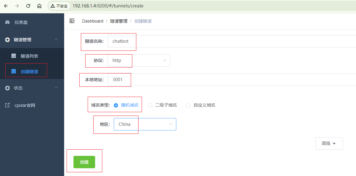 点击左侧仪表盘的隧道管理——创建隧道,创建一个chatbot的公网所在隧道!