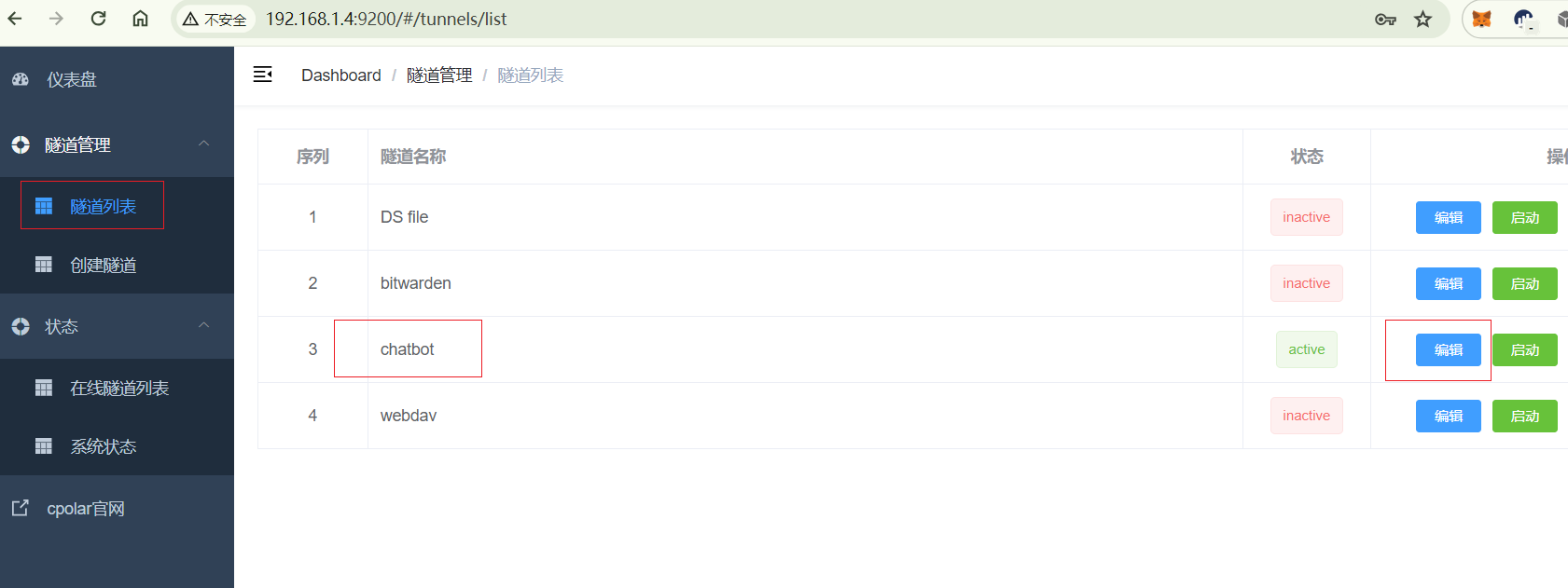 返回登录Cpolar web UI管理界面,点击左侧仪表盘的隧道管理——隧道列表,找到所要配置的隧道,点击右侧的编辑