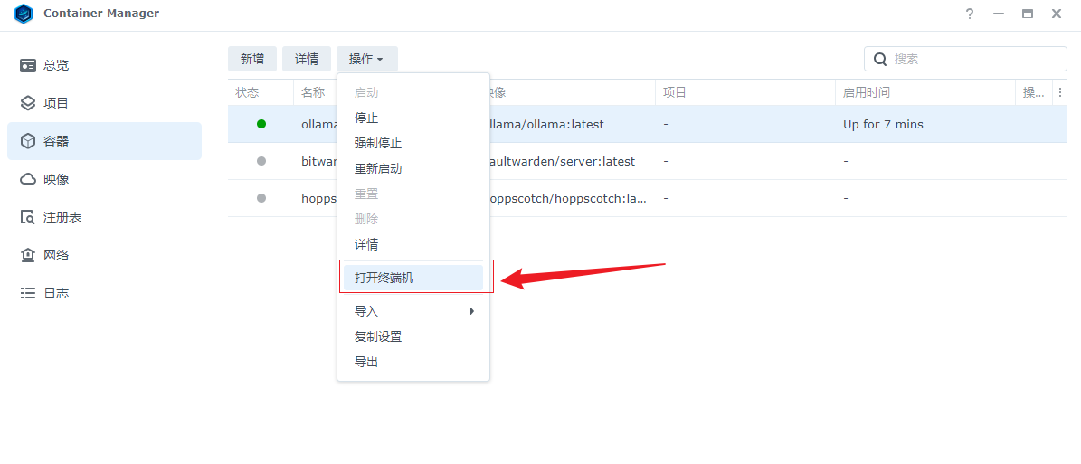 运行后,打开容器界面,可以看到运行的服务,下面开始下载运行Llama 2模子,点击选中ollama容器,点击操作