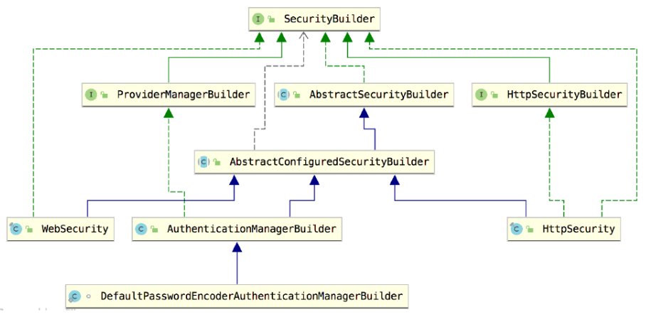 Spring Security中所有需要构建的对象都可以通过SecurityBuilder来实现,默认的过滤器 链、代理过滤器AuthenticationManager 等,都可以通过 SecurityBuilder来构建。SecurityBuilder的实现类如图4-2所示。