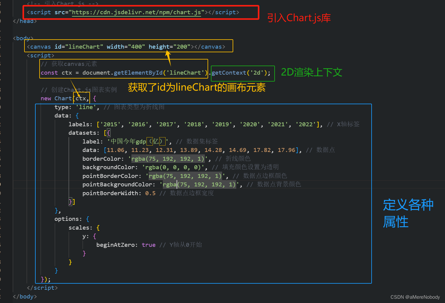 - 通过 document.getElementById('lineChart') 获取了ID为lineChart的画布元素。