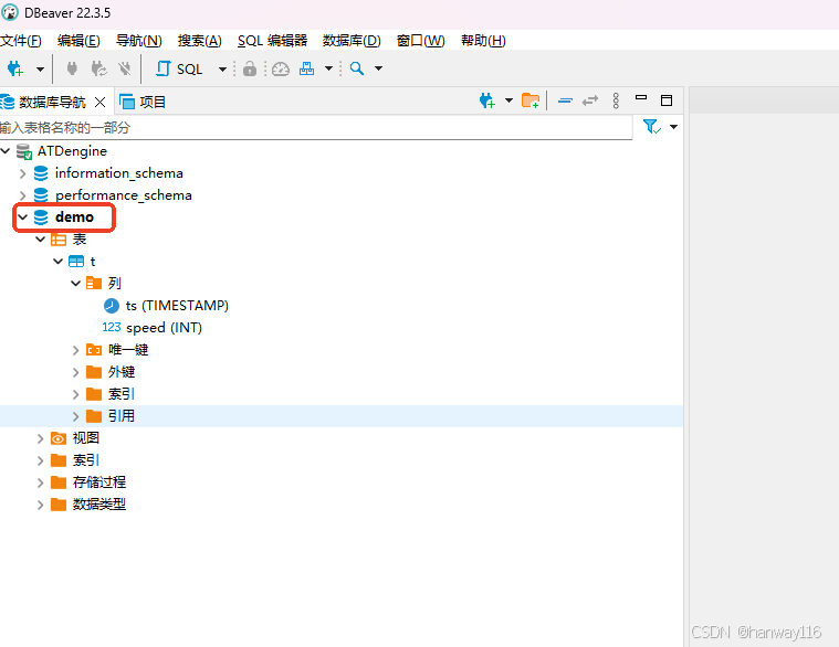 左侧点击双击睁开 能看到上面步骤中创建的demo数据库以及创建的t表和默认数据库