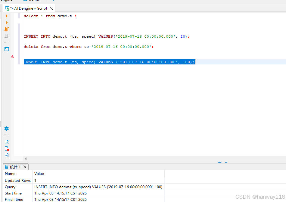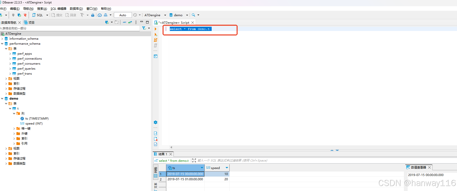 输入一条查询SQL select * from demo.t 按住 Ctrl+Enter 快捷键实行语句