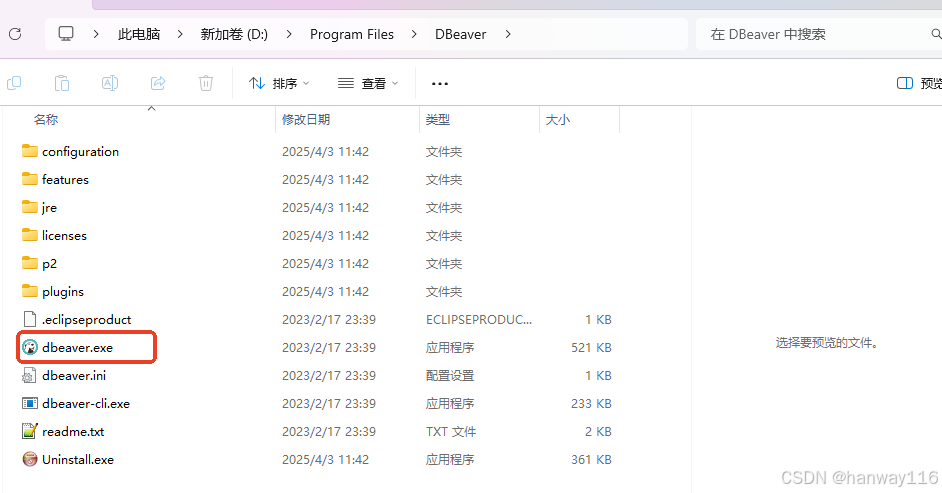 下载完双击安装程序开始安装。安装完成后找到安装目录下的 dbeaver.exe 双击启动dbeaver