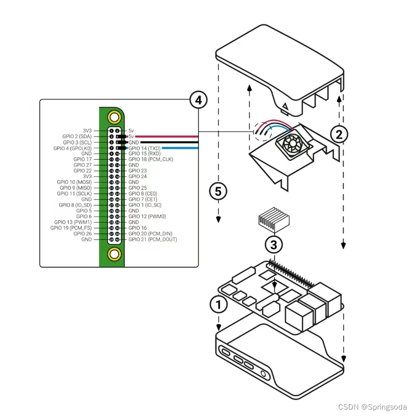 将官方风扇插入官方壳上盖中,风扇正面朝下,然后将树莓派插入官方壳底座中,确保安装牢固,然后将风扇连线至gpio接口,同时将官方壳盖上。