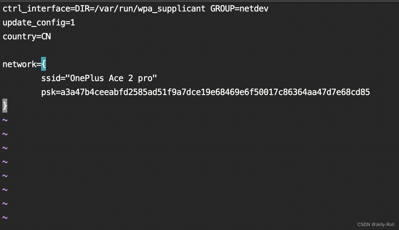 我们要配置的就是network后面的那一大长串,如果不需要连接默认的Wi-Fi时可以直接修改,如果想要配置一个新的Wi-Fi的话。可以添加如下代码。(ssid代表你的wifi名称,psk是你的Wi-Fi密码,输入你的Wi-Fi密码就好,我这里采用了加密密码模式,直接输入原始密码是一样的)