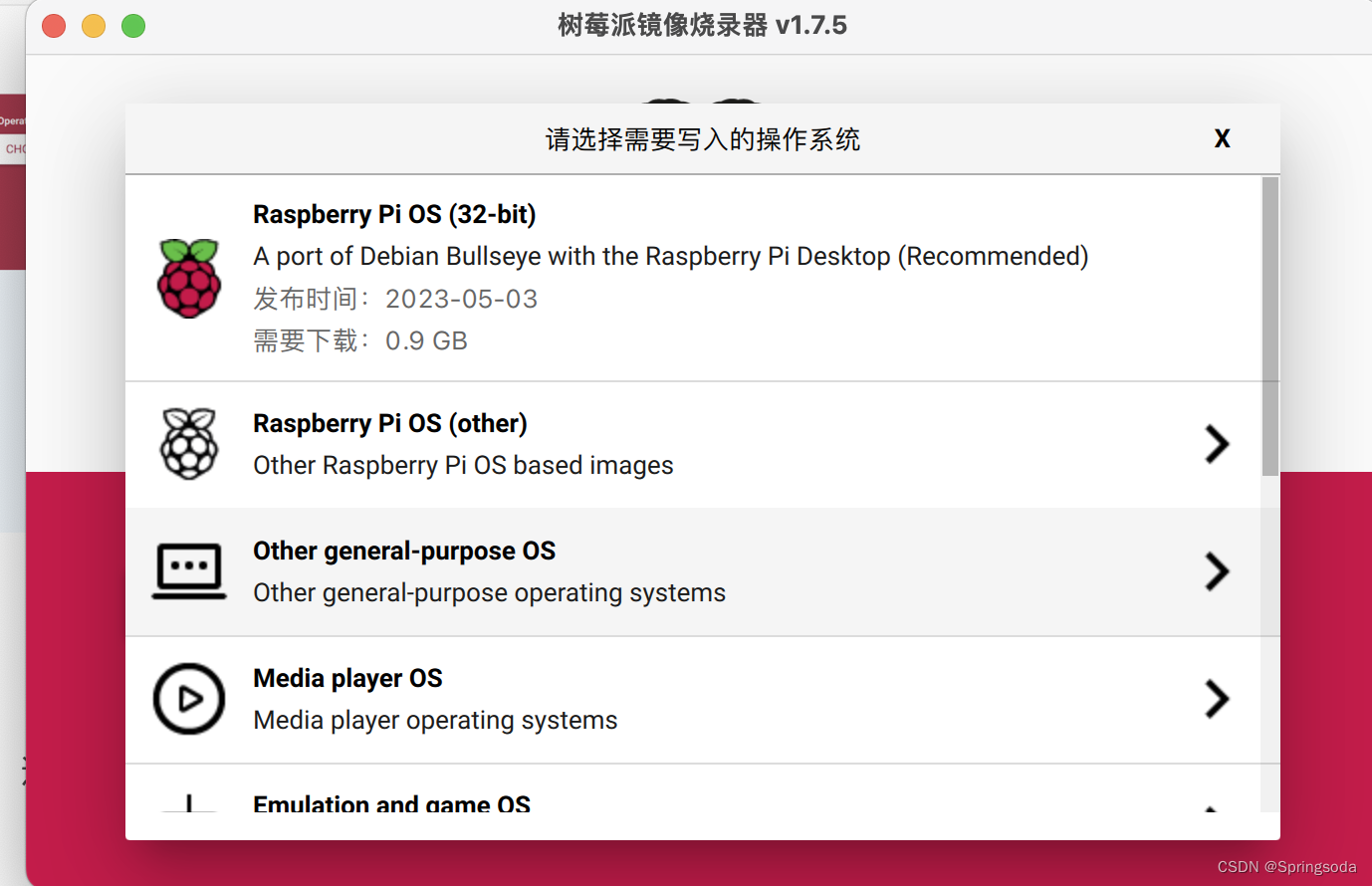 打开树莓派烧录器后,点击CHOOSE OS(选择操作系统)进入系统下载界面,选择你所需要下载的系统并确定。(64位的pi os需要点击raspbe pi os(other),选择raspberry pi os(64-bit))。作者在此选择的是pi os lite(64-bit)。