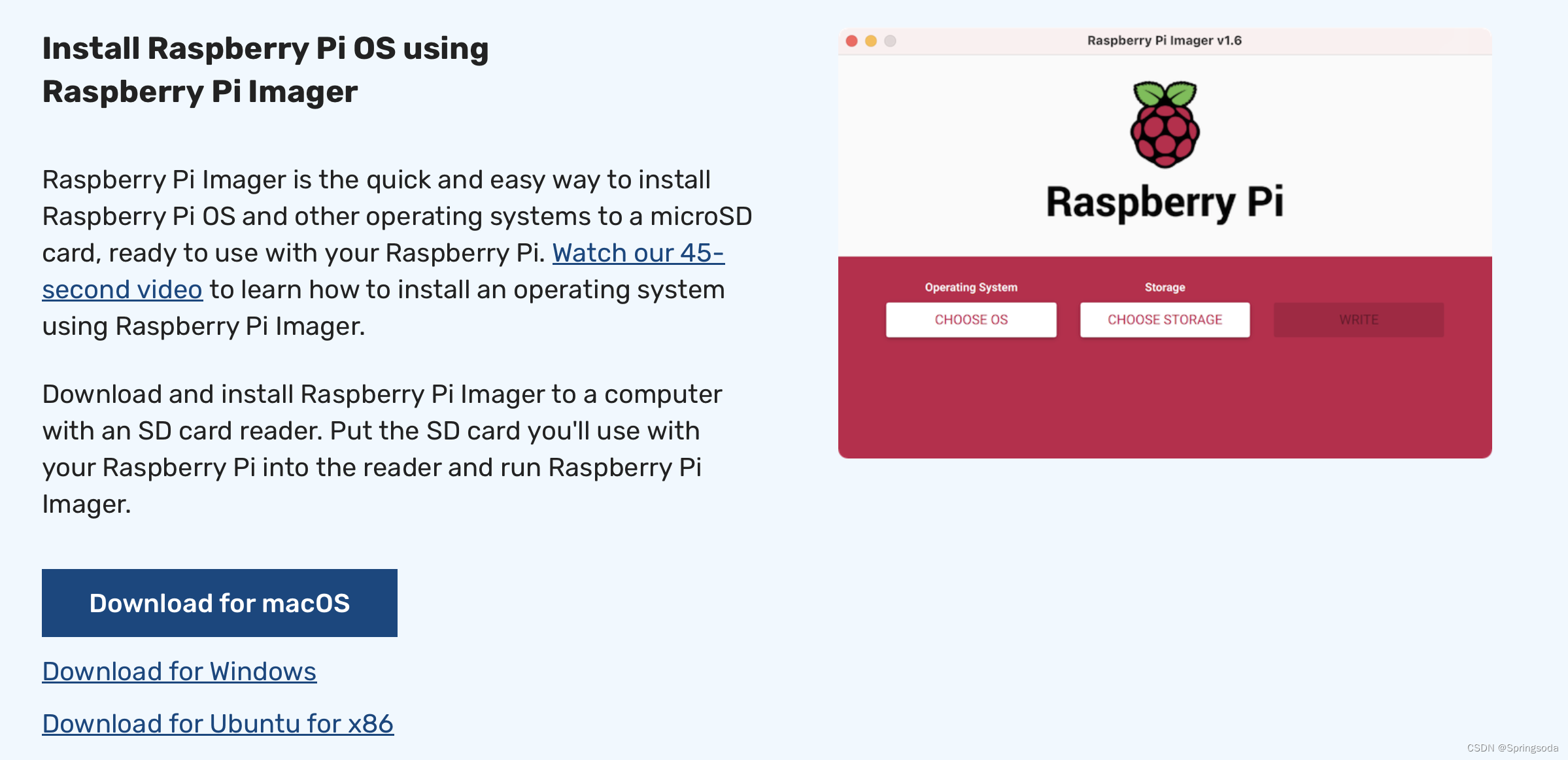 首先去树莓派官方网站(Raspberry Pi OS – Raspberry Pi)下载对应系统的镜像烧录软件。