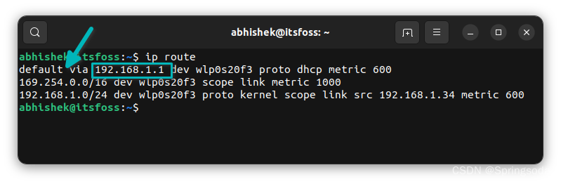 第一行的default via后显示的便是网关地址,也就是路由器地址。