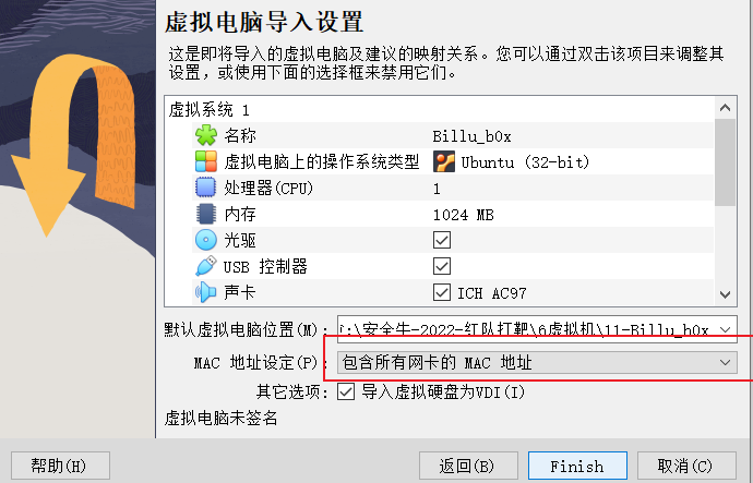 6)注意事项:靶机导入时,选择包含所有网卡的MAC地址