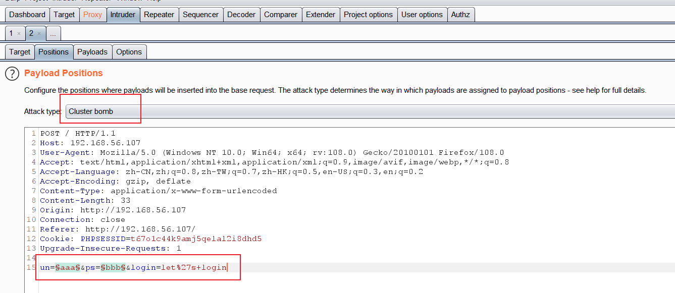 ②只选择变量为用户名和密码,且攻击方式为cluster bomb