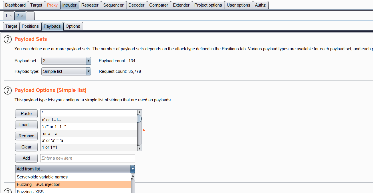 6)通过burp工具的intruder模块,选择来进行SQL注入攻击的载荷字典,对其进行SQL注入