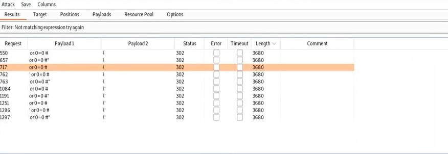 ③选择用户名字典为自带的fuzzing-SQL injection,选择密码字典为kali中的/usr/share/seclists/Fuzzing/SQLi/Generic-SQLi.txtBurp