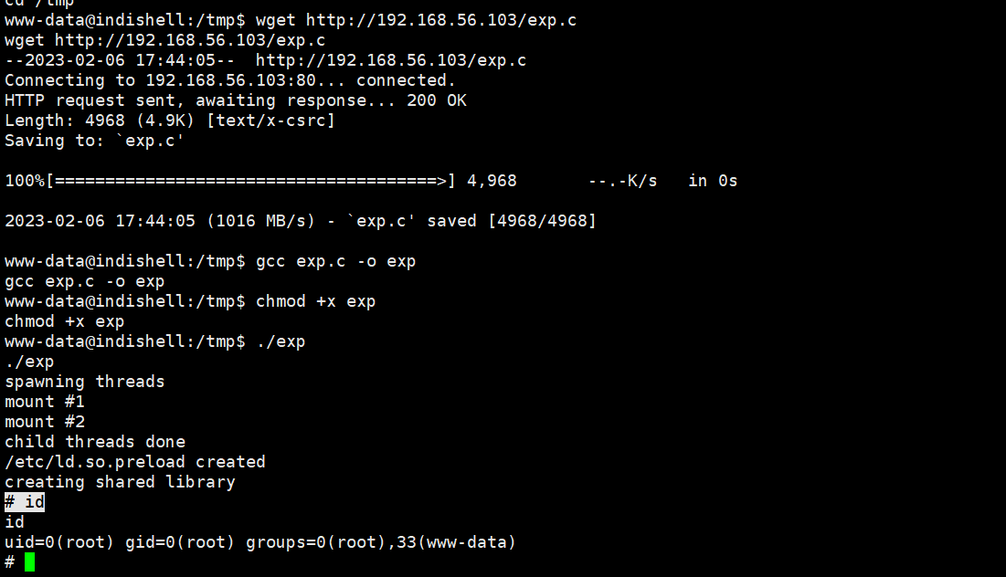 19)目标靶机下载利用脚本,编译,执行,获取到root权限- $ cd /tmp