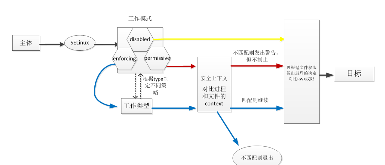 类型字段是安全上下文中最重要的字段,进程是否可以访问文件,主要就是看进程的安全上下文类型字段是否和文件的安全上下文类型字段相匹配,如果匹配则可以访问。