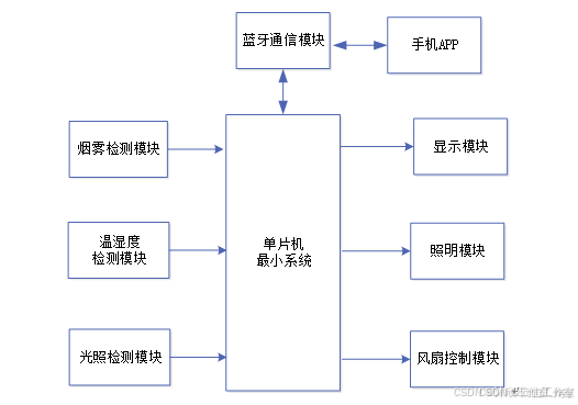 本次基于STM32的智能家居蓝牙体系,其体系总体架构如图2.1所示,接纳STM32f103单片机作为控制器,通过DHT11传感器实现温湿度检测,MQ-2烟雾传感器实现烟雾检测,光敏电阻实现光照检测,同时将数据通过HC-05蓝牙模块上传到手机APP,用户可以通过手机APP实现对LED灯的开关控制,以及设定温度的报警阈值,如果温度太高会启动风扇进行降温,并将检测的参数通过OLED12864液晶进行表现。