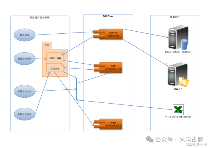 系统”内,并分发给其用户利用。所以用户采用了GSP(数据血缘分析SDK)+ SQLFLow Ingester(数据摄取)+ Widget(数据血缘展示)组合的方式完成了系统集成。集成方法如下图所示: