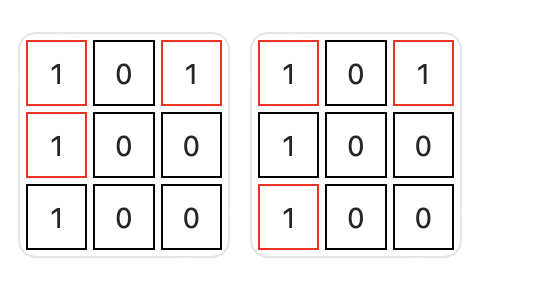 输入:grid = [[1,0,0,0],[0,1,0,1],[1,0,0,0]]