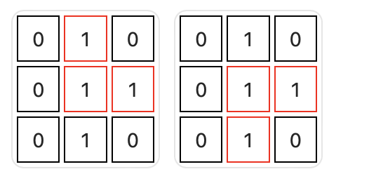 有 2 个值为 1 的直角三角形。留意蓝色的那个 没有 构成直角三角形,由于 3 个元素在同一列。