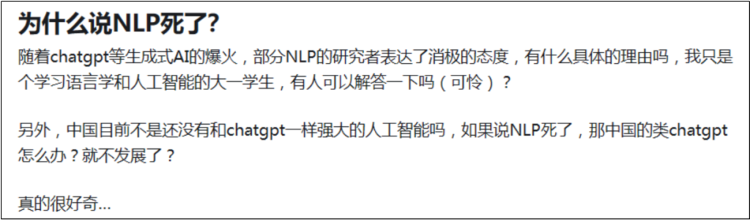 自从 ChatGPT 横空出世以来,自然语言处置惩罚(Natural Language Processing,NLP) 研究领域就出现了一种消极的声音,认为大模子技术导致 NLP “死了”。在某乎上就有一条热门问答,大家热烈地讨论了这个题目。