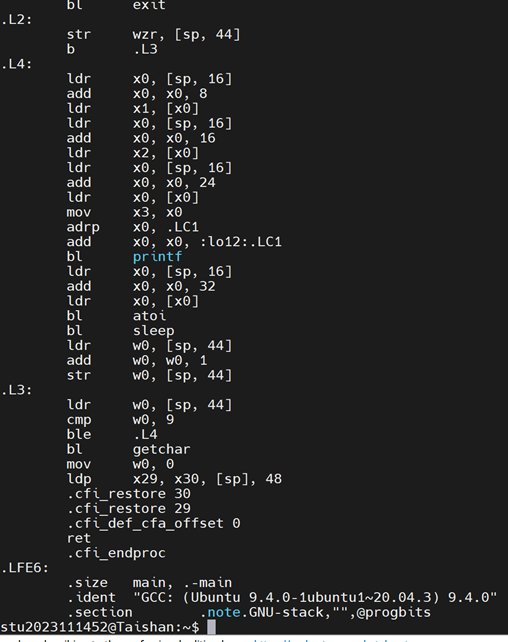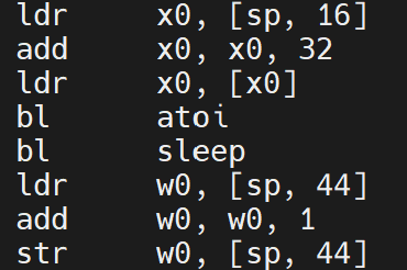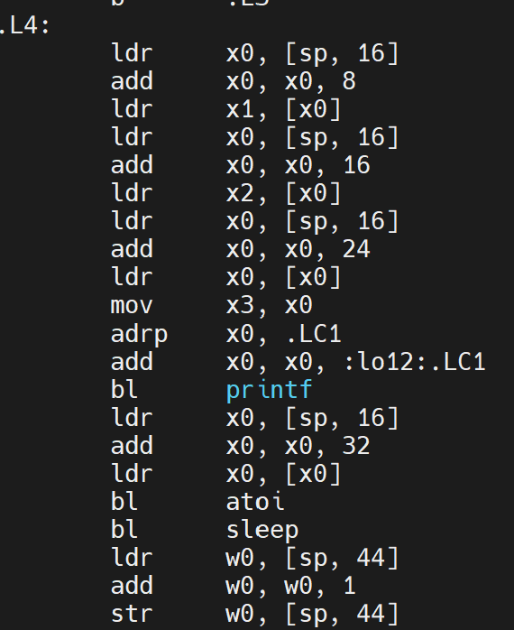 因为sleep中使用了argv[4],在调用这个函数之前必要先找到他,按照原本的调用1,2,3的过程,指针必要先被定位到x0,但因为print函数也用到了x0寄存器(hello等内容存在x0里),一顿操作之后现在x0里面到底放了什么很难包管了,以是首先必要在调用sleep之前重新加载指针,确保x0寄存器里村的东西是正确的argv[1],这样才方便通过加八找到argv4.