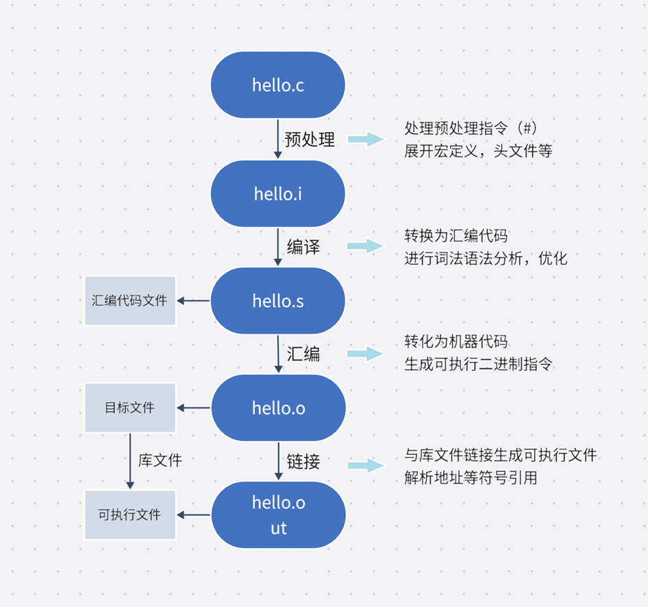 P2P:即From Program to Process,指hello.c从程序(Program)变为运行时历程(Process),将其变成可执行文件的重要步调流程如下: