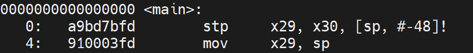这一部门是main函数最开始用于分配栈的内容。stp x29, x30, [sp, -48]!用于生存帧指针 x29 和链接寄存器 x30 到栈顶,后面的大括号内容表现sp 向低地址移动 48 字节,分配栈空间(用于局部变量和参数通报),! 表现更新 sp 的值。