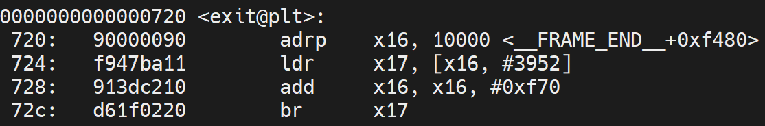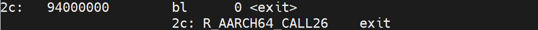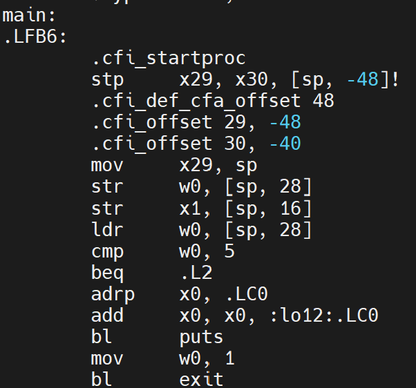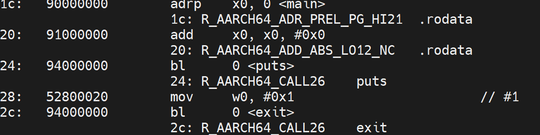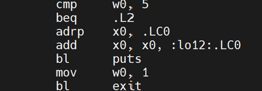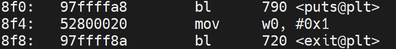 mov w0, 1 和 bl exit设置返回值 1 并退出程序。