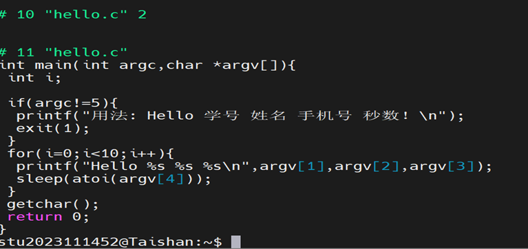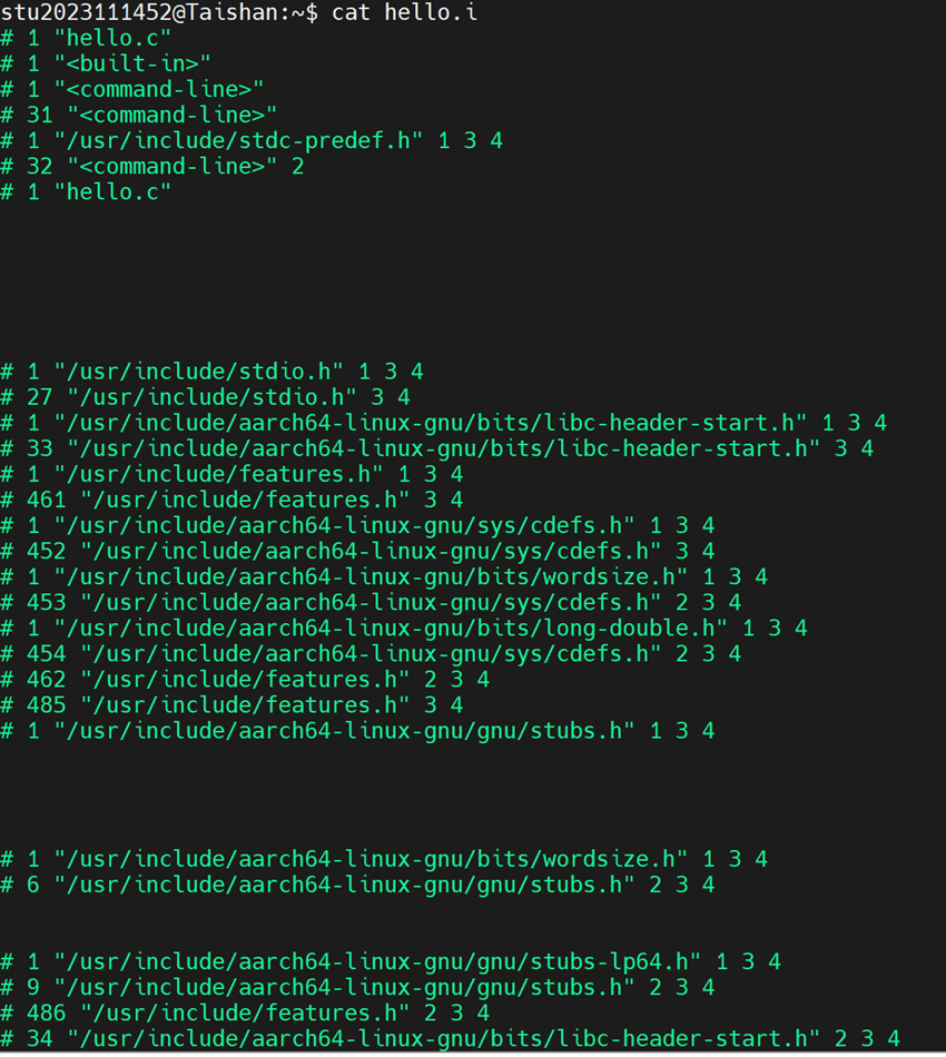 使用cat显示hello.i的内容,我们可以发现输出结果有几千行,根本上满是预处理指令,而main程序并没有发生变化: