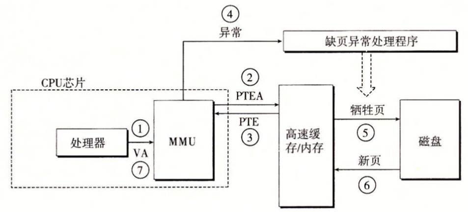 缺页中断时,内核从磁盘加载页面到内存,更新页表和TLB
