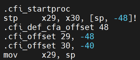注意.cfi_* 指令,是一段调试信息,用于栈展开(如 .cfi_def_cfa_offset 48 表现当前栈帧偏移为 48)。这是一个布局内容。