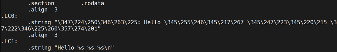 .LC1用于存储格式化字符串:"Hello %s %s %s\n",用于后续printf调用。