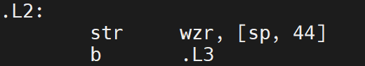 重要用于给i赋值和跳进i对应的L3循环,这两条指令也是这个意思,.L2: str wzr, [sp, 44]用于将 32 位零寄存器 wzr 的值(即 0)存入栈偏移 44 字节处,作为循环变量 i 的初始值;b .L3用于跳转到循环条件判定 .L3。