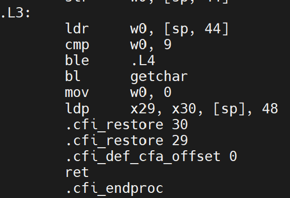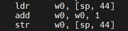 完成循环后,程序将从L3的判定中退回上级,此时更新i的值,ldr w0, [sp, 44]重新加载循环变量i,add令i++,str w0, [sp, 44]将i存回栈偏移 44 字节处