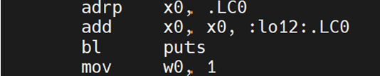 adrp x0, .LC0:加载 .LC0(错误信息)的页地址到 x0。