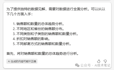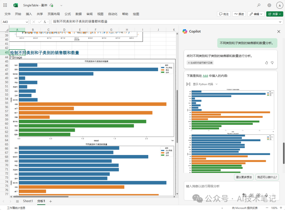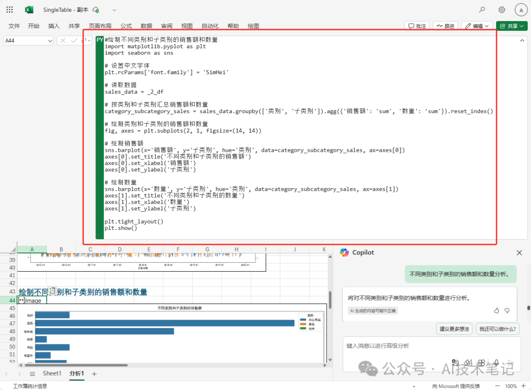 比如我们对第3个标题比力感爱好,就可以告诉copilot:“差别种别和子种别的贩卖额和数量分析”,它很快就会调用Python直接天生对应的图表: