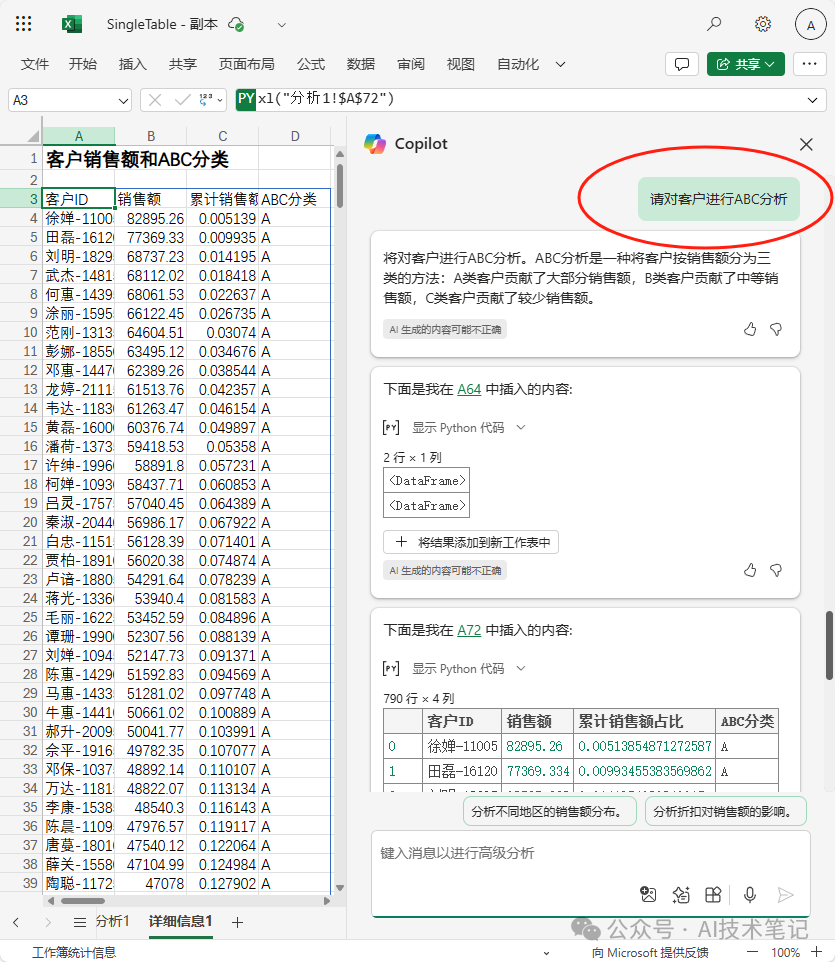 比如你不知道从那边听说了“ABC分析”,大概知道这东西是用来干啥的,但是没有任何编程根本,啥也不会,不知道从那边入手,不要紧,你只须要告诉copilot,“请对客户举行ABC分析”,copilot立刻告诉你ABC分析是怎样举行的,