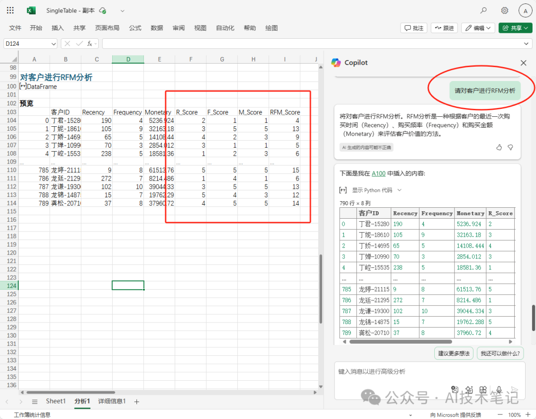 又过了几天,你不知道从那边听说了另有个“RFM分析”好像挺好的。同样,你照旧对此一无所知,你仍旧只是对copilot说了一句,“请对客户举行RFM分析”,copilot同样很快地举行一番利用,给你美满答案: