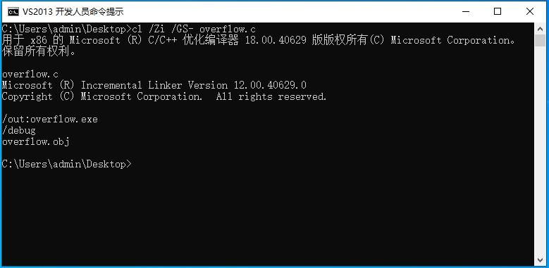 复制代码 请自行打开VS编译器中的开发人员命令提示,然后执行cl /Zi /GS- overflow.c编译并生成可执行文件,参数中的/GS-就是关闭当前的GS保护。